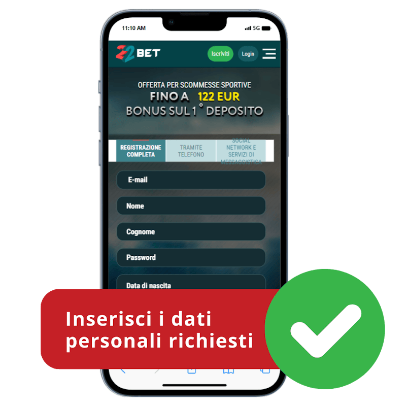 Arrivato sul sito di 22Bet, il bonus di benvenuto sarà preselezionato per te: ti basterà compilare i dati personali richiesti e procedere con il resto della registrazione.
