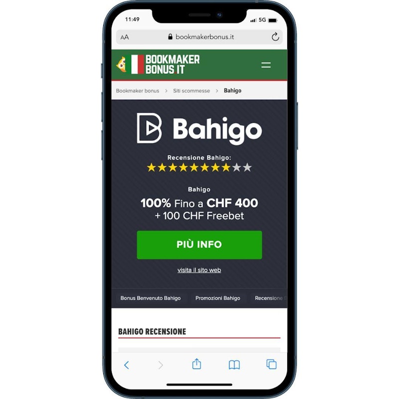 Per accedere su Bahigo dalla Svizzera ti basterà cliccare sul nostro tasto "Più Info": in questo modo avrai accesso al bonus esclusivo.