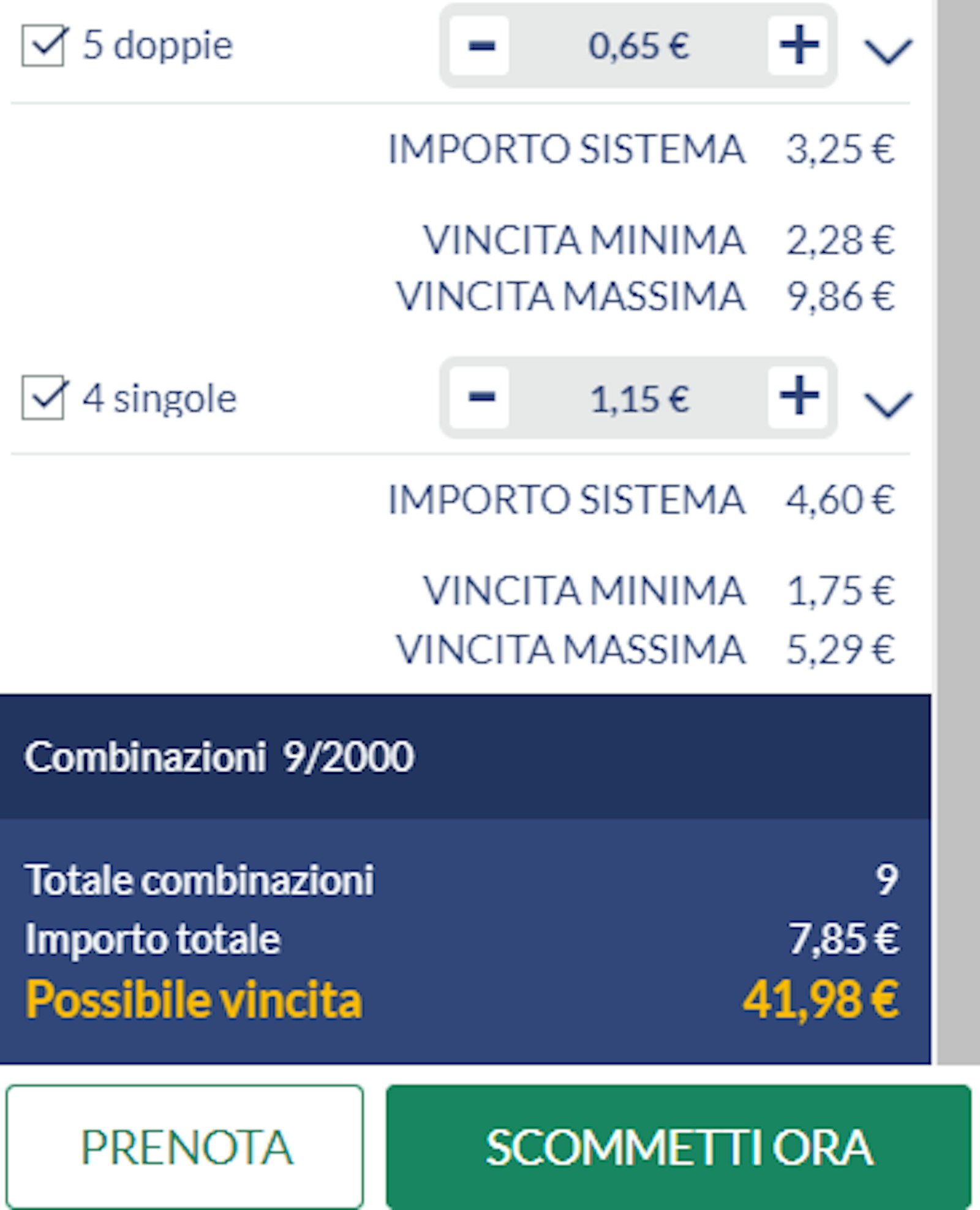 E' fondamentale che tu visualizzi attentamente l'anteprima della tua scommessa con sistema perchè puoi vedere esattamente quanto puoi vincere e puoi decidere di conseguenza se levare o aggiungere qualche evento.