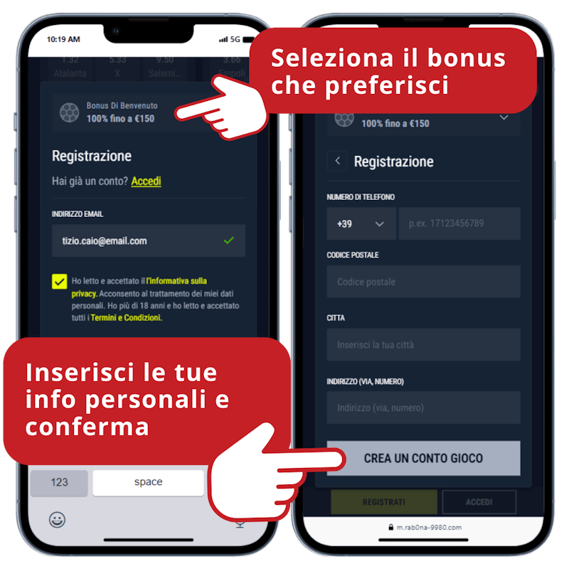 Registrarsi e aprire un conto di gioco sul sito di scommesse Rabona non è solo semplice ma è super veloce! Ti bastano indirizzo mail, codice fiscale e numero di telefono per creare un account in meno di 5 minuti!