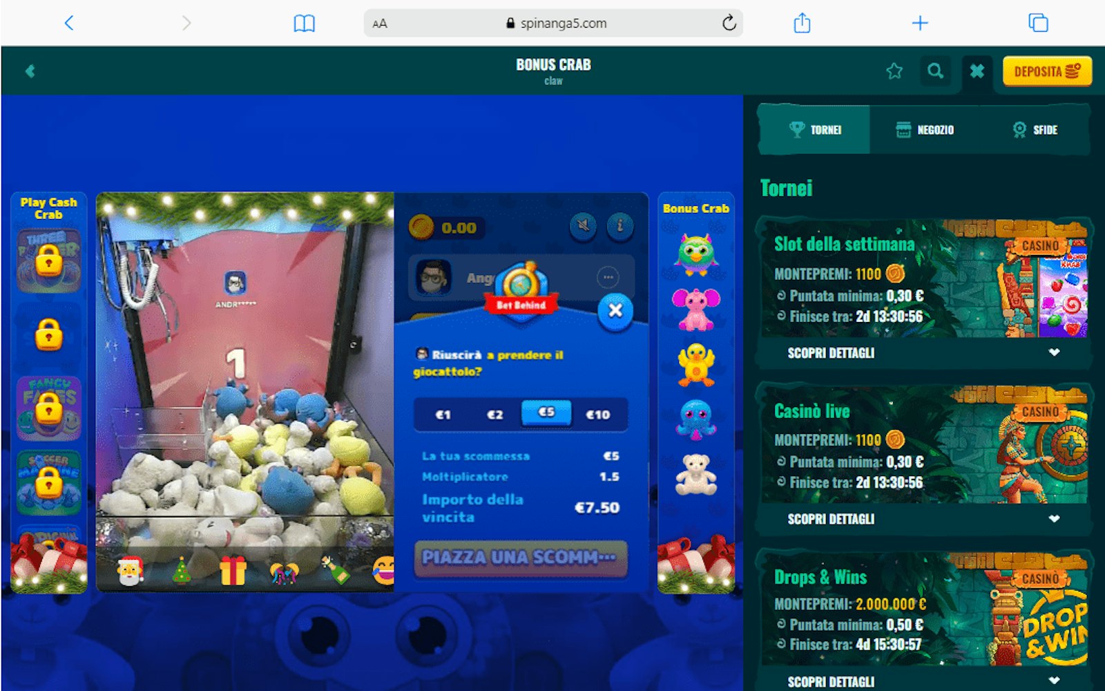 Il Bonus Crab (anche detto bonus granchio) di Spinanga è un incentivo present nel bonus di benvenuto, che permette di scommettere da 1 a 10 CHF attraverso una macchina pesca premi.