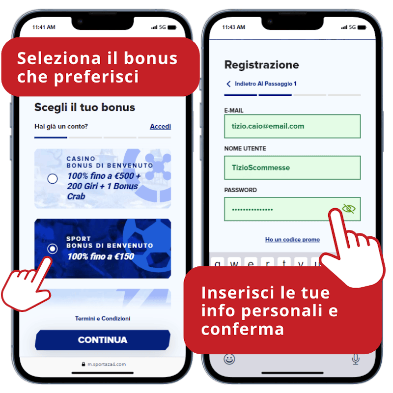 Una volta selezionato il bonus benvenuto, ti sarà richiesto di inserire i tuoi dati personali. Compila i campi richiesti e premi il pulsante di conferma per creare il tuo conto di gioco Sportaza.
