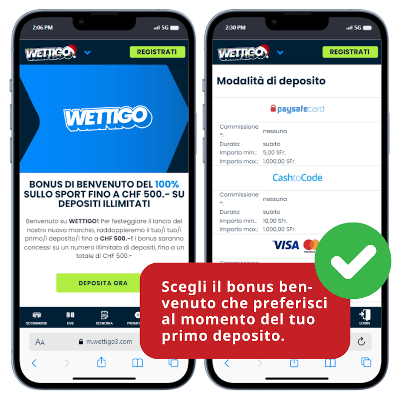 Per chi vuole cimentarsi nel mondo delle scommesse sportive, Wettigo offre un bonus del 100% sui tuoi primi depositi, fino a un massimo di 500 CHF.