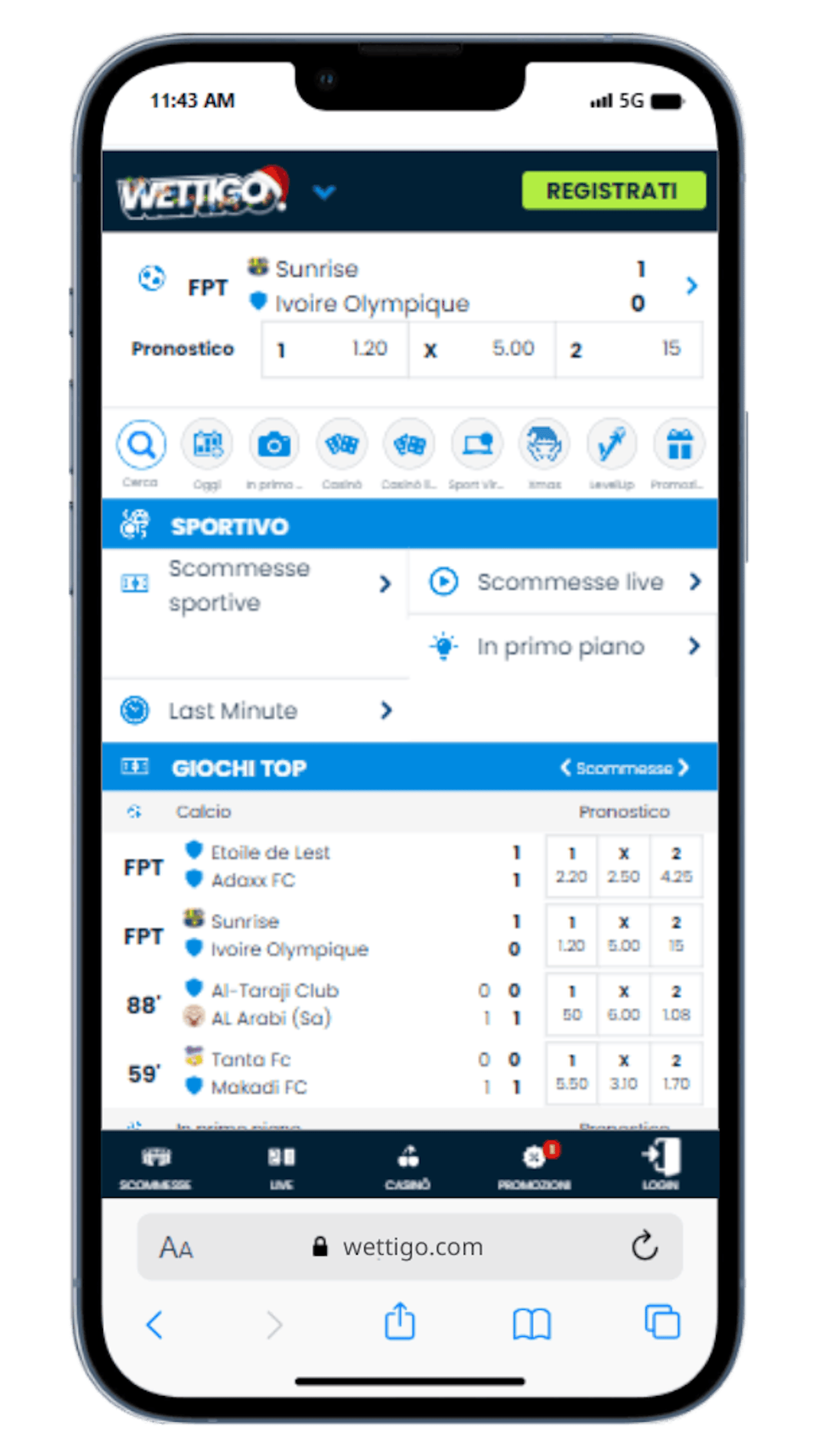 Wettigo ha un'intera sezione dedicata alle scommesse live che ti permettte di scommettere su eventi sportivi in diretta.